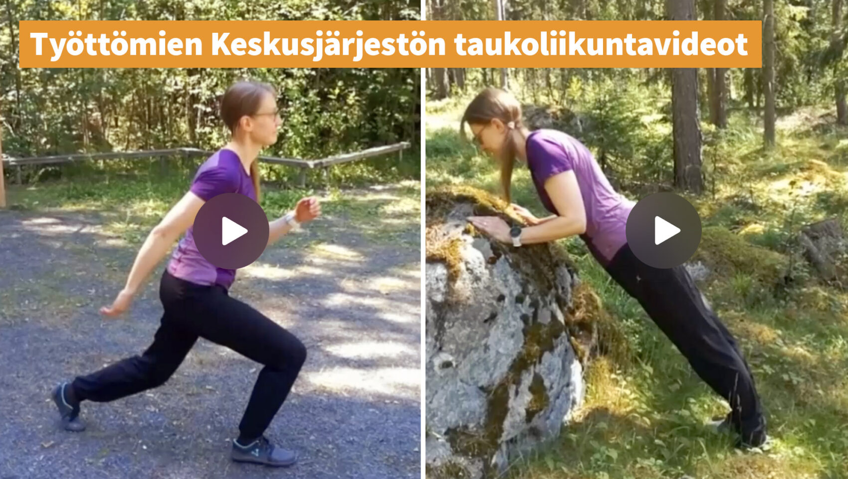 Tutustu Työttömien Keskusjärjestön taukoliikuntavideoihin. Valittavana on lyhyitä ja hieman pitkäkestoisempia ohjeita liikkumiseen sisä- ja ulkotiloissa. Kaikki liikkumaan säännöllisesti viikottain!