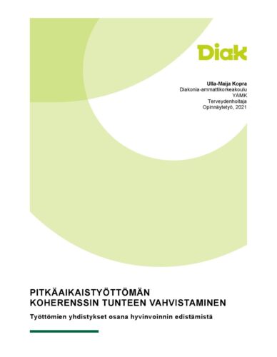 Opinnäytetyössäni selvitin, millainen merkitys työttömien yhdistystoiminnalla on haastateltujen viiden pitkäaikaistyöttömän voimavaroille ja millaiset tekijät vahvistavat heidän koherenssin tunnettaan. Tutkimustulokset jakautuivat neljään eri teemaan: hyvinvointia ja terveyttä edistävä toiminta, sosiaalisia voimavaroja tukeva toiminta, vapaaehtoistoiminta ja työtoiminta. Teemat nousivat esille osallistujien kuvailemista omakohtaisista kokemuksista. Kertomusten perusteella saatiin tietoa siitä, mitkä tekijät vahvistavat osallistujien voimavaroja.